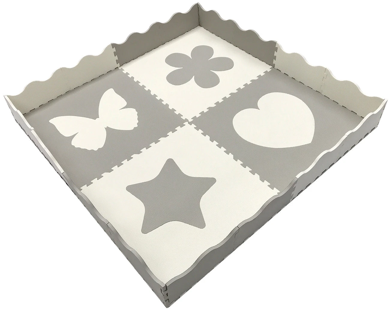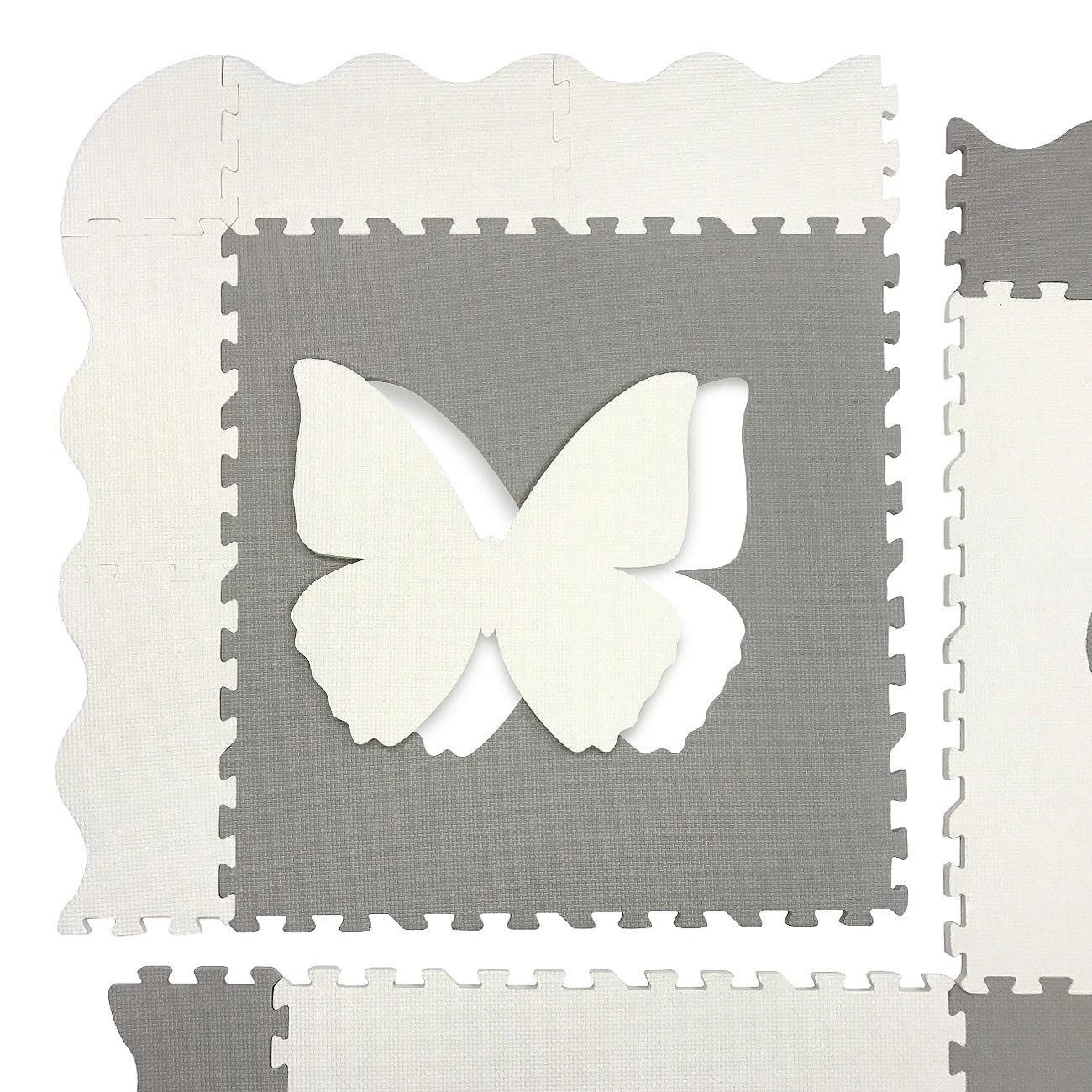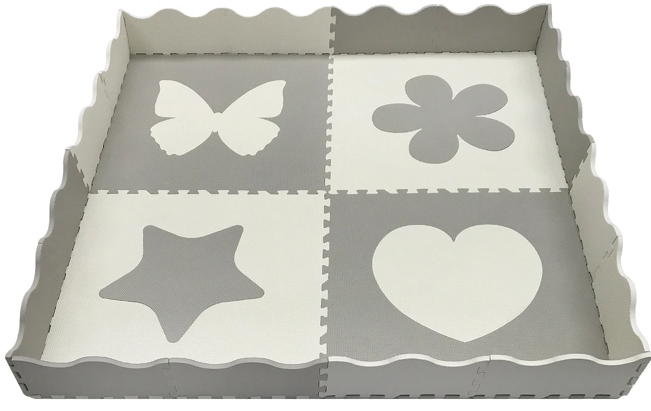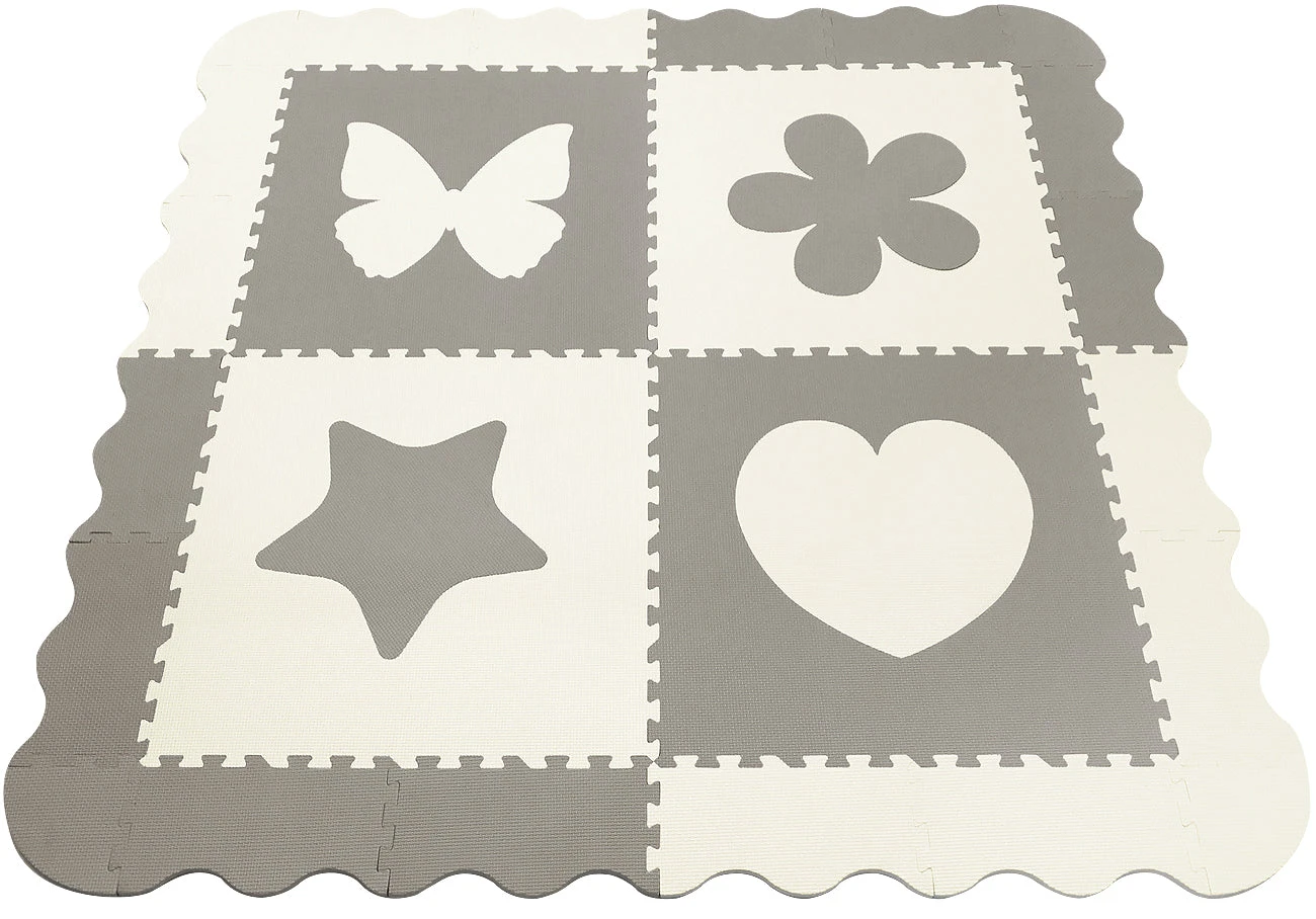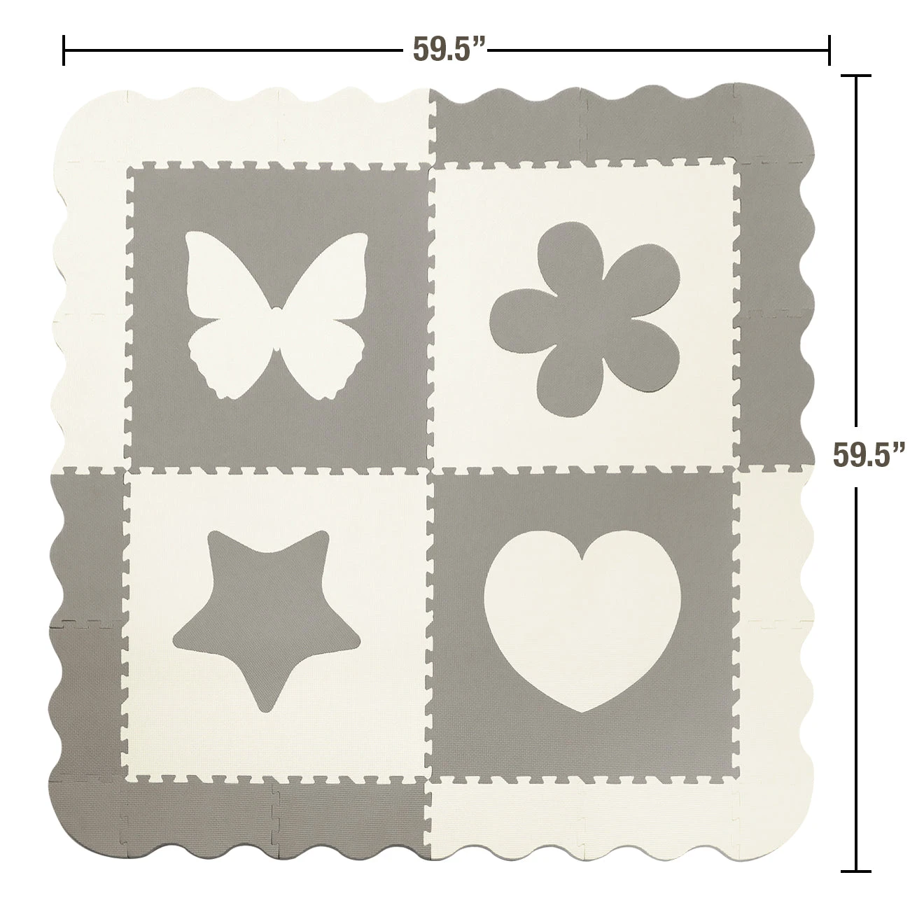 - STYLISH & FUN DESIGN ? Gray/White foam puzzle tiles (4 tile pieces with borders) ? Neutral modern colors complement most home dรฉcor ? Fun tile patterns include Butterfly, Star, Heart, Flower ? BPA/Lead/Toxic Free ? Each square tile measures approximately 24? x 24? ? Entire Unit Approximately 59.5?? x 59.5?